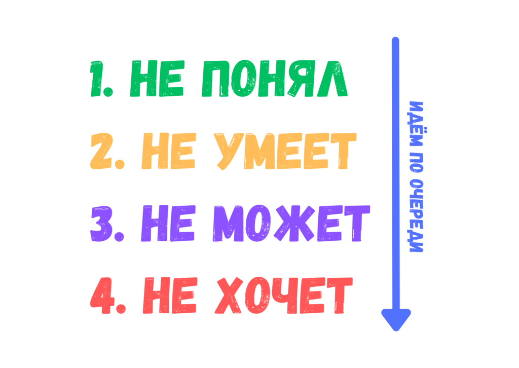 Причина “Не хочет” — это интуитивно простое и понятное объяснение. Но на деле в подавляющем большинстве случаев истина лежит где-то в первых 3-х причинах.